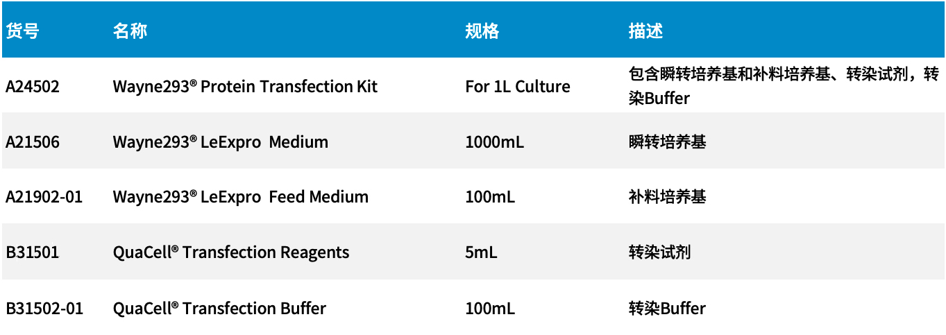 Wayne293® Protein Transfection Kit 是一种悬浮培养的人胚肾细胞(HKE 293细胞)的高产量瞬时表达套装,套装包括瞬转培养基,补料培养基,转染试剂及缓冲液,通过化学瞬时转染技术高效表达目标蛋白,实现悬浮 HKE 293细胞的高效率瞬转表达,为蛋白质功能研究,结构解析和药物开发等提供可靠的保障。