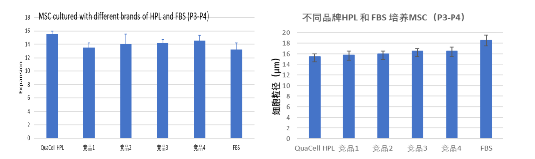 在培养人脐带来源间充质干细胞过程中,将基础培养基分别添加不同品牌的 5% HPL 及 FBS。结果显示,使用 QuaCell® HPL 的实验组在 P3 代至 P4 代细胞扩增过程中表现优异,扩增倍数可达15倍,展现出良好的细胞增殖支持能力。