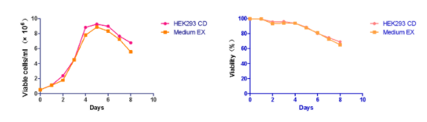 Figure 1. Performance of HEK293T cells in Batch culture of QuaCell® HEK293CD media and commercial medium (Medium EX). 125 mL shake flask, working volume 125 mL, φ26 mm, 125 rpm, humidity 75%, CO2 5%,cultured at 37 ° C for 10 days. When the glucose is less than 3 g/L, it is supplemented to 6 g/L.