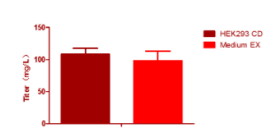 Figure 2. Protein production of a recombinant protein-expressing HEK293T cell after 10 days of batch culture in QuaCell® HEK293CD and commercial medium EX. 125 ml shake flask, working volume 30 ml, φ26 mm, 125 rpm, humidity 75%, CO2 5%, cultured at 37 ° C for 10 days. When the glucose is less than 3 g/L, it is supplemented to 6 g/L.